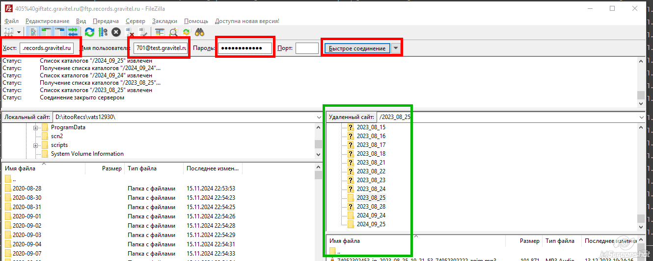 Когда служба технической поддержки сообщит о готовности FTP сервера, то можно будет выполнить подключение через любой FTP клиент. Данные для подключения:Адрес сервера - ftp.records.gravitel.ru логин - учетная запись владельца в виде "короткий_номер@домен", пример - 701@test.gravitel.ru пароль - актуальный пароль для вход в ЛК владельца АТС